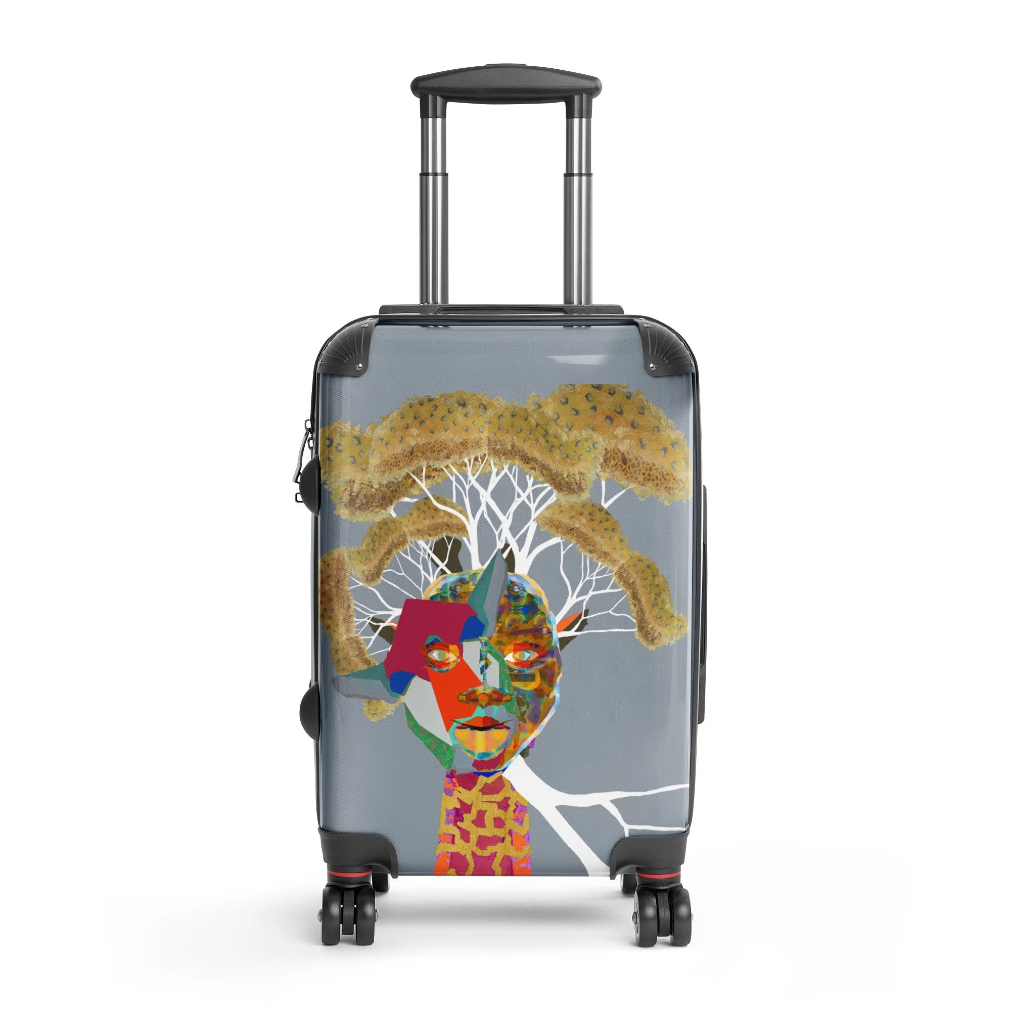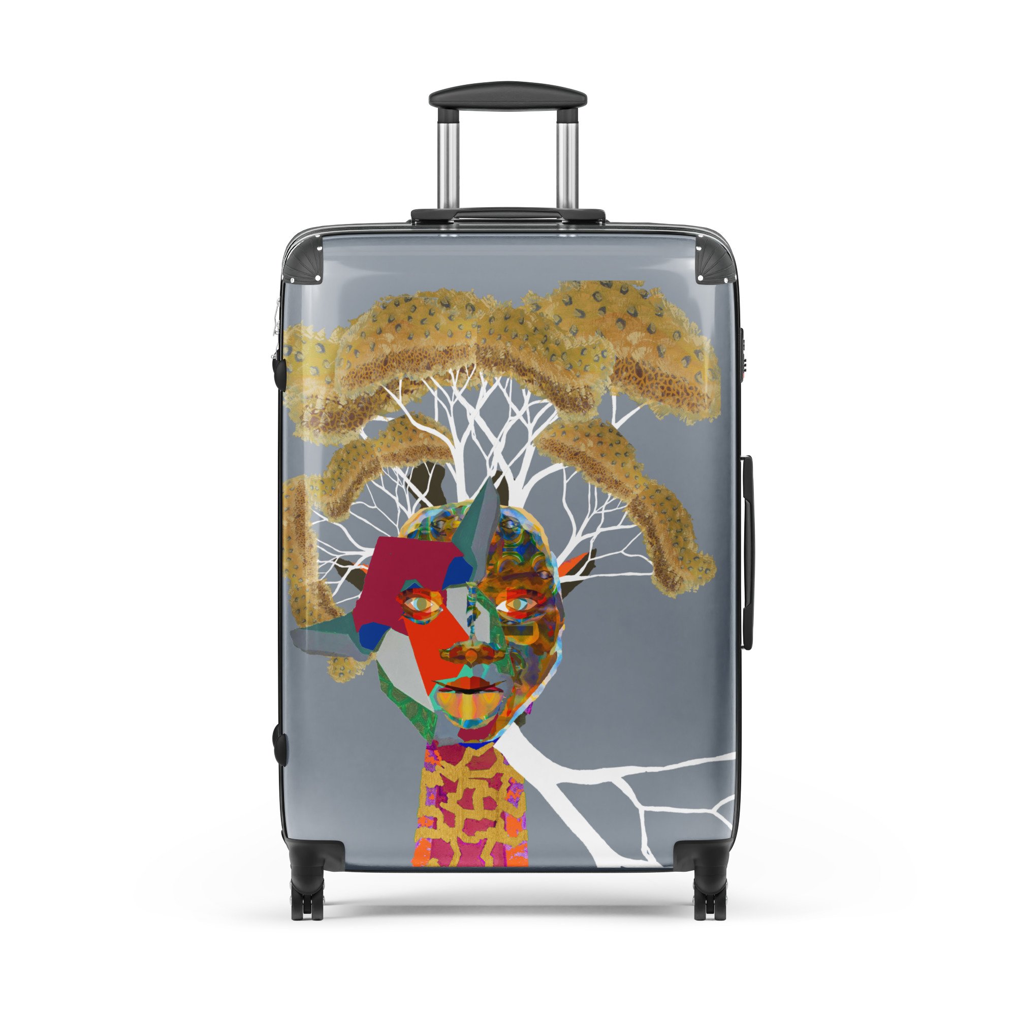 At the heart of this extraordinary work, two expressions of the same face emerge side by side — one rendered in bold, fragmented planes of crimson, cobalt, and teal like a cubist dream; the other shimmering in iridescent golds and bronzes, as if glimpsed through a mirror that reveals more than it reflects. Together, they are not opposites — they are twins. Two truths of the same soul.